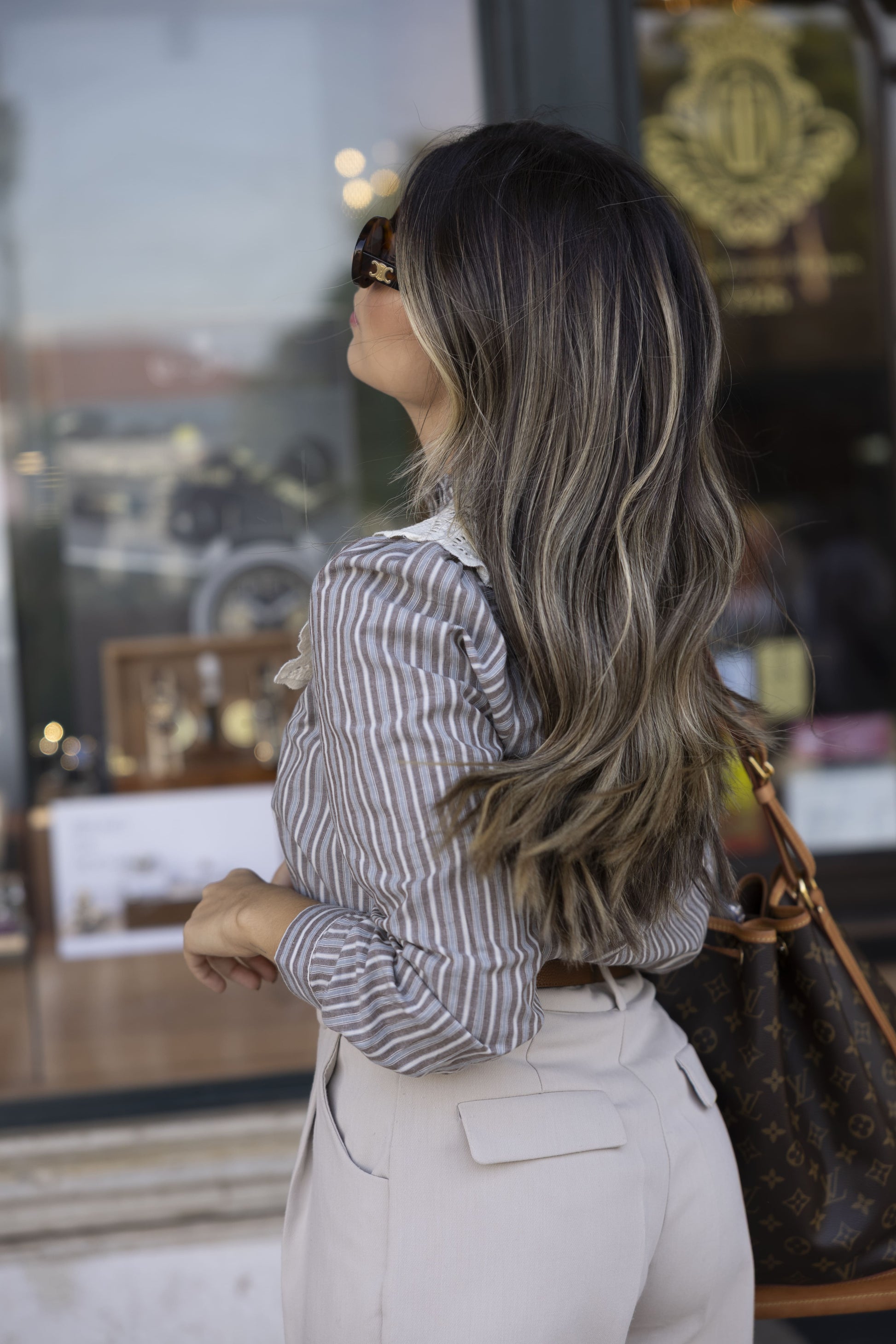 A Camisa Alfama é a fusão perfeita entre tradição e modernidade. As riscas em tons neutros azul, bege e castanho criam uma paleta natural e versátil, enquanto a gola bordada adiciona um toque feminino e sofisticado.