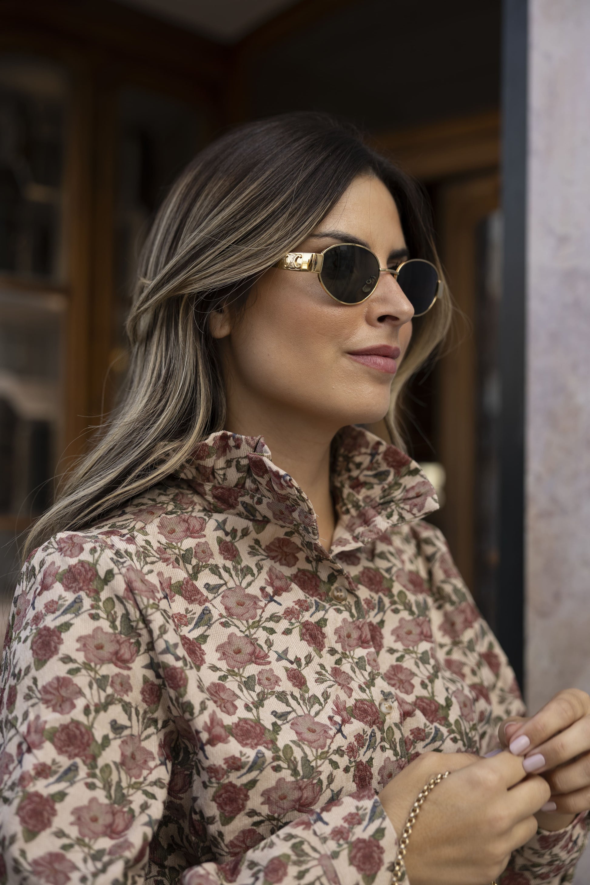 A Camisa Carmo é a expressão do romantismo em versão outono. Confecionada em bombazine macia, apresenta um padrão floral em tons de rosa que se mistura com uma paleta outonal acolhedora.