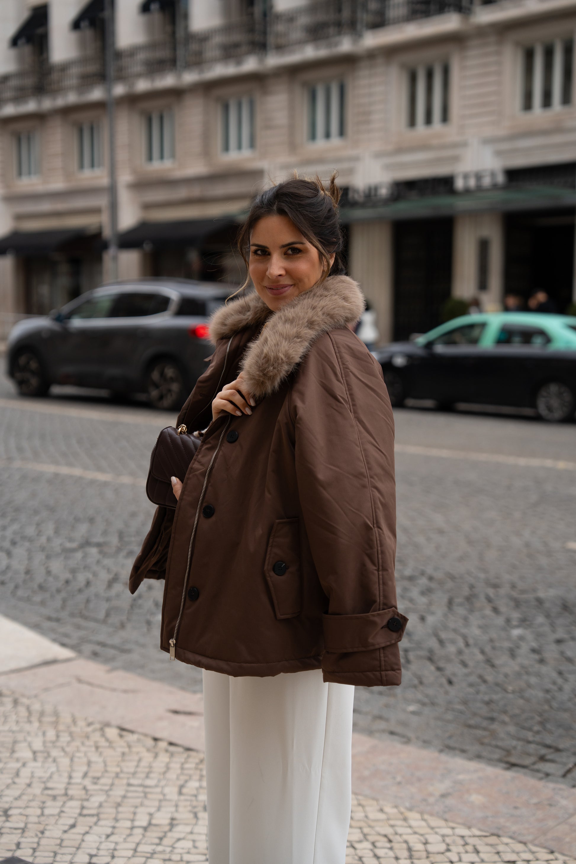 Com um tom castanho profundo e um corte oversized moderno, combina conforto absoluto com um visual sofisticado. O destaque vai para a gola ampla em pelo sintético macio, que acrescenta um toque luxuoso e caloroso ao look.