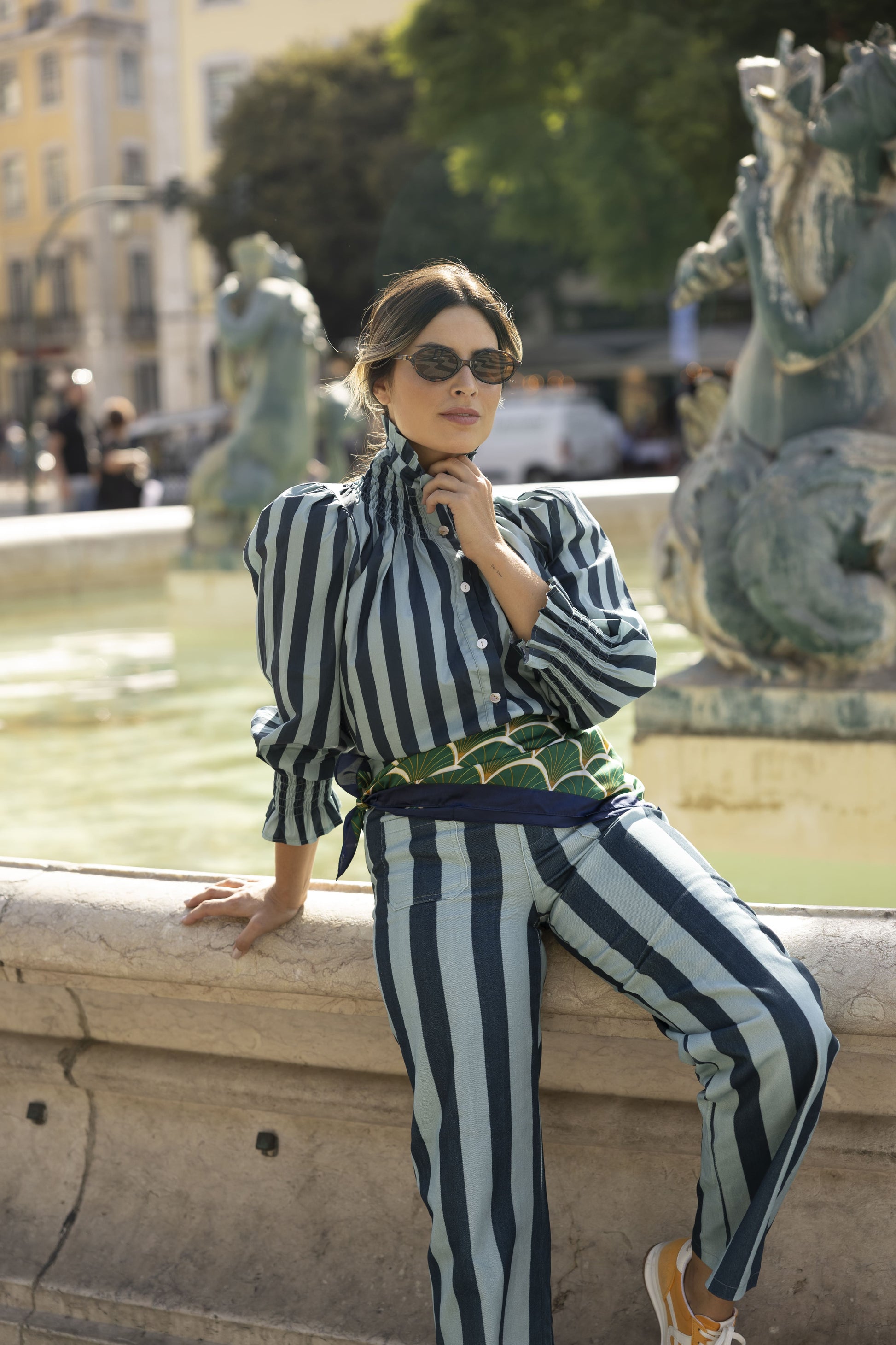 O Conjunto Belém é a celebração da leveza e do estilo descontraído. Inspirado no charme de Lisboa, apresenta-se em riscas de azul-turquesa e azul-escuro, criando uma paleta fresca e jovem ao estilo de uma verdadeira Portuguese girl.