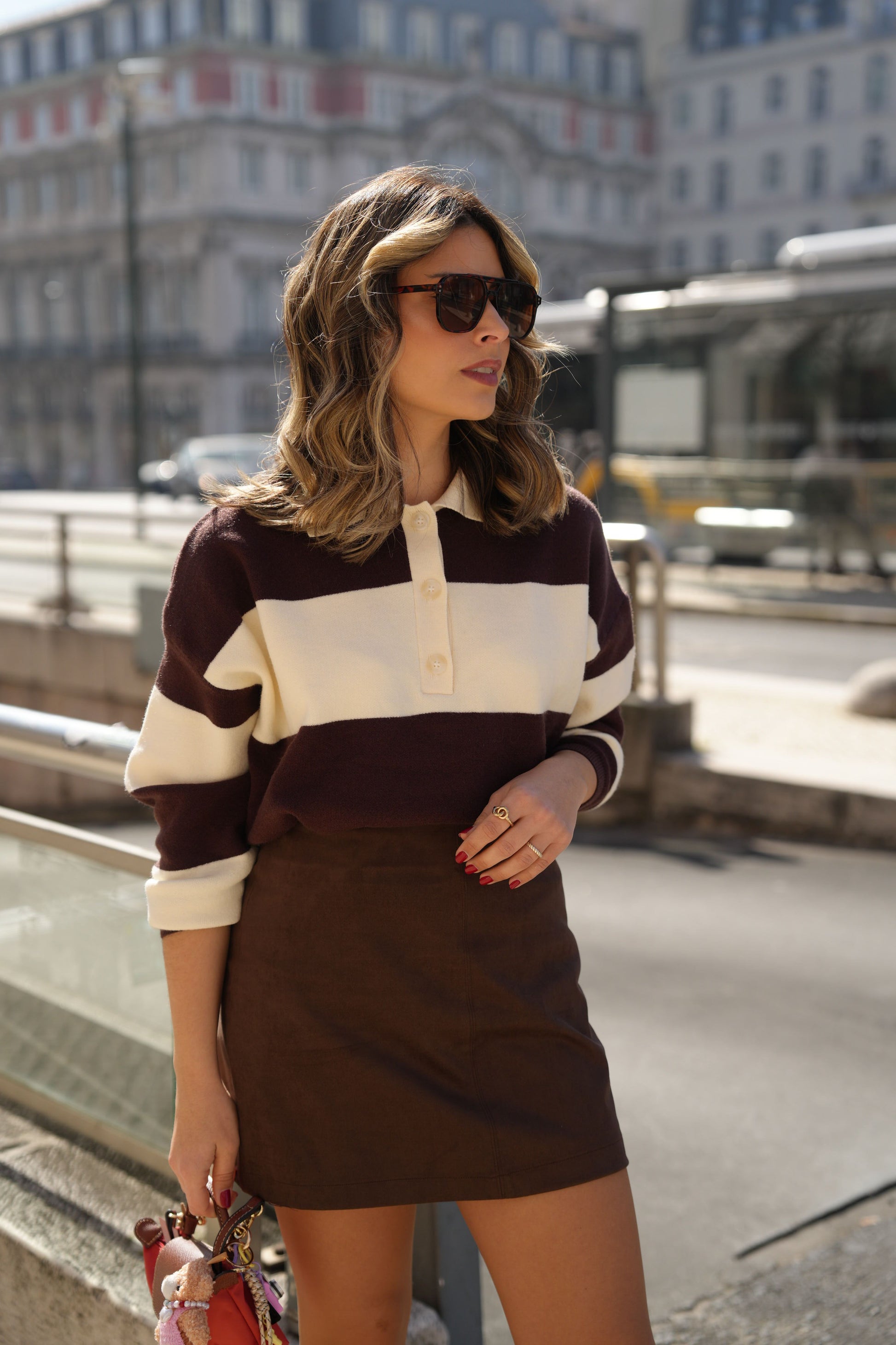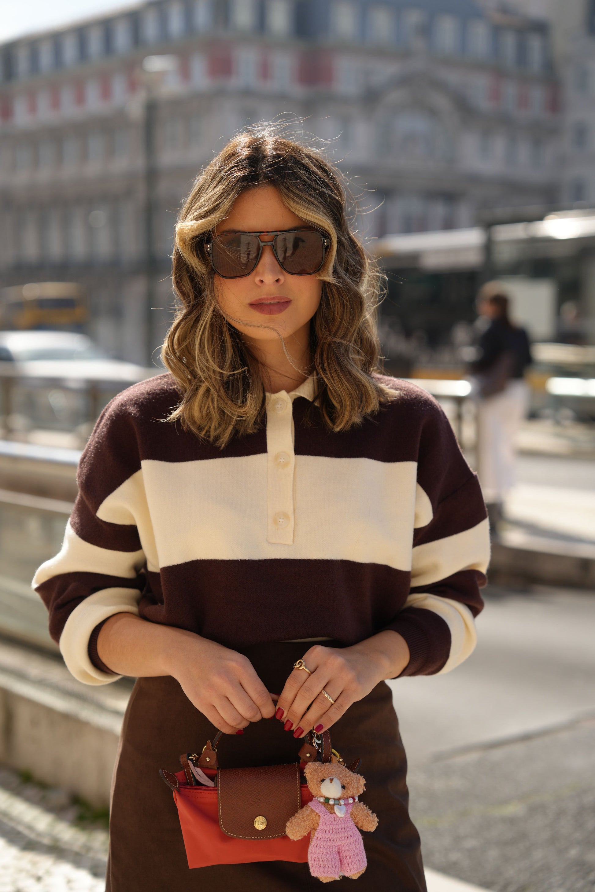 As riscas bege e castanho criam uma paleta quente e intemporal, perfeita para looks effortless mas cuidadosa.
