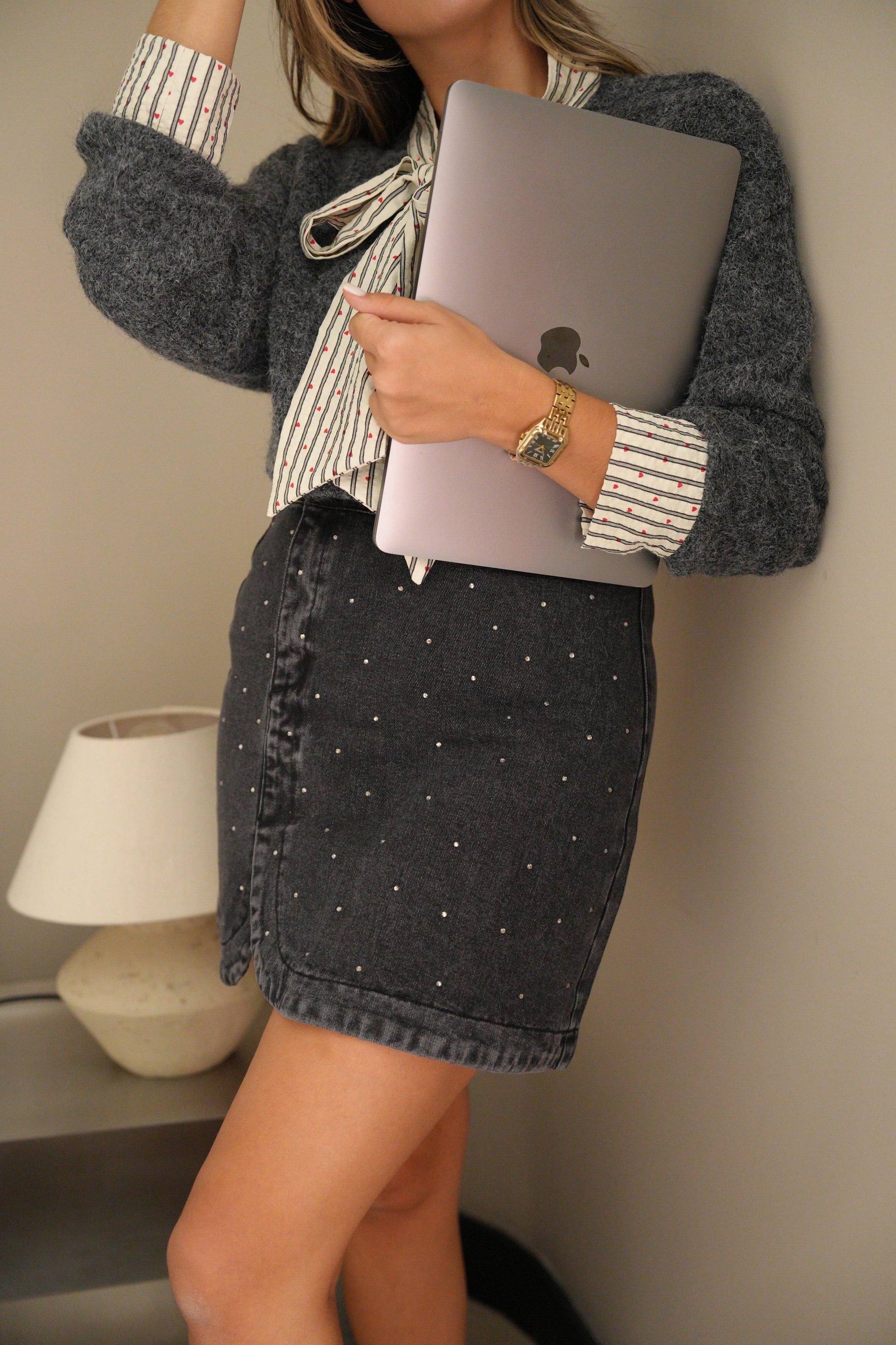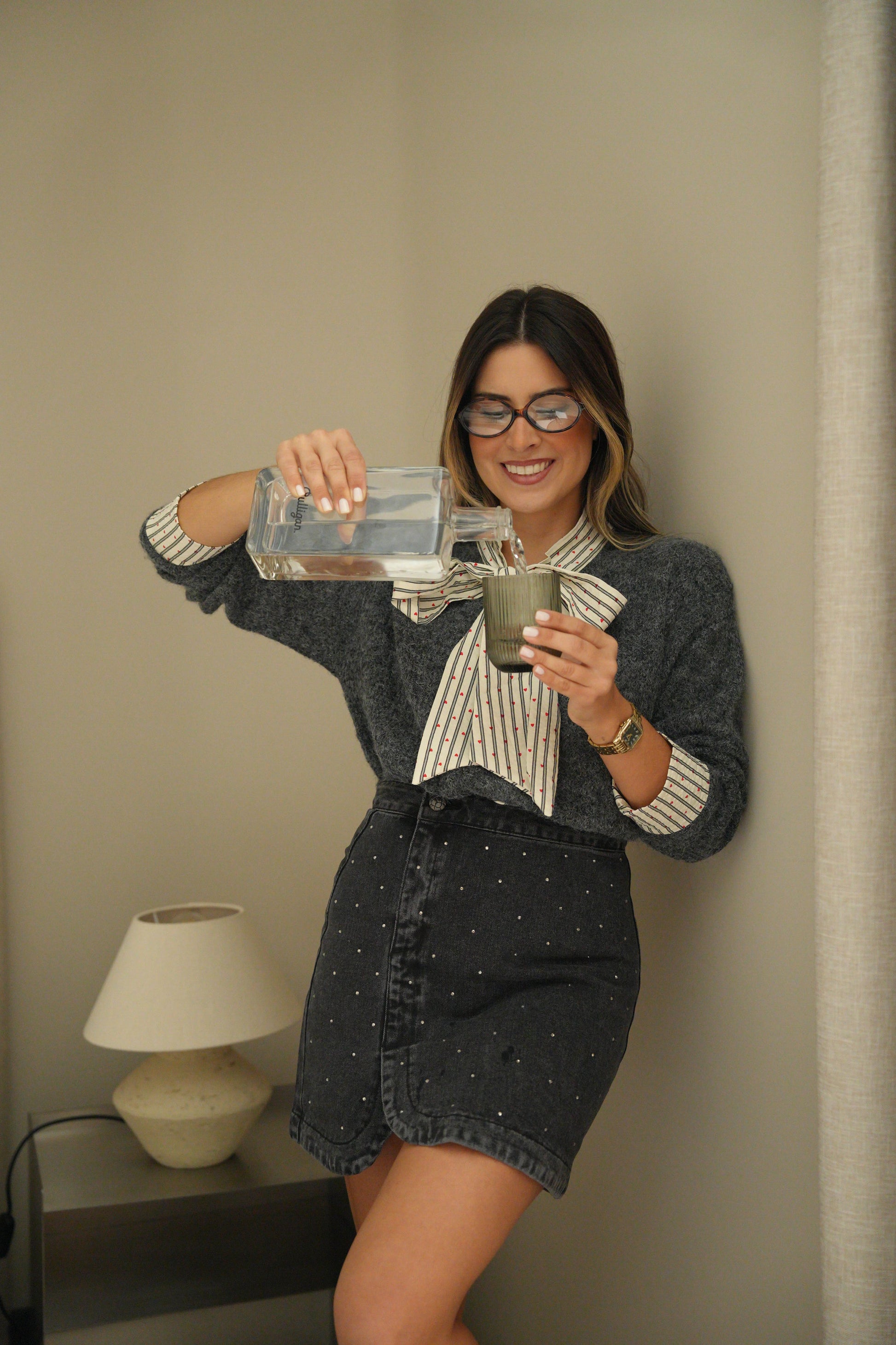 Com uma silhueta estruturada e detalhes brilhantes, combina confiança casual com um toque feminino.