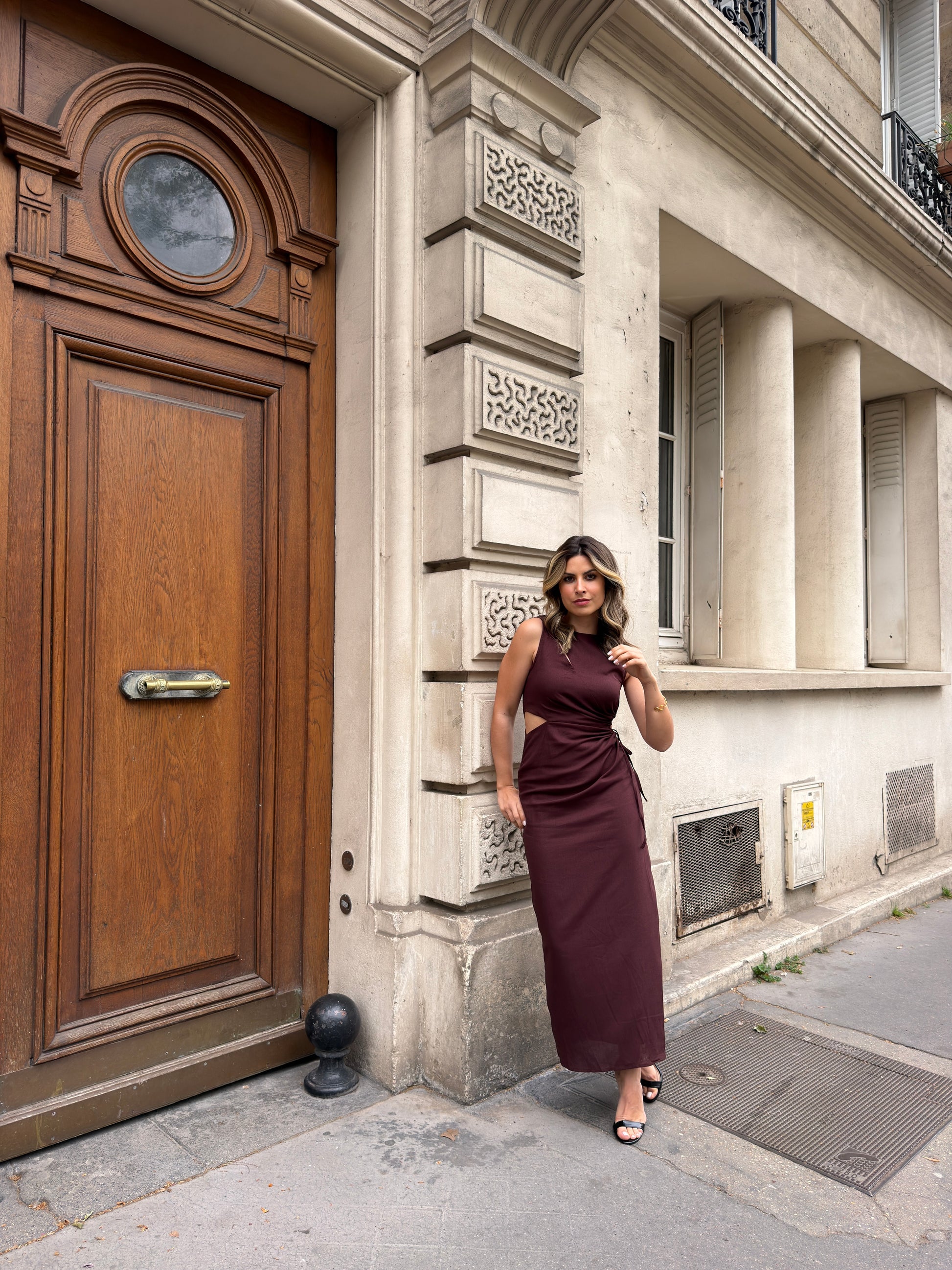 O Vestido louvre é peça desta estação. Em tom chocolate profundo com gola redonda e sem mangas, os recortes assimétricos na cintura revelam a pele de forma subtil e sofisticada, um pormenor que transforma um vestido elegante numa peça verdadeiramente especial.